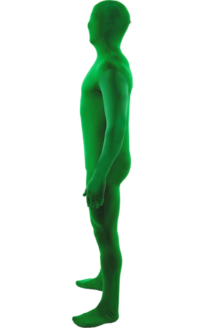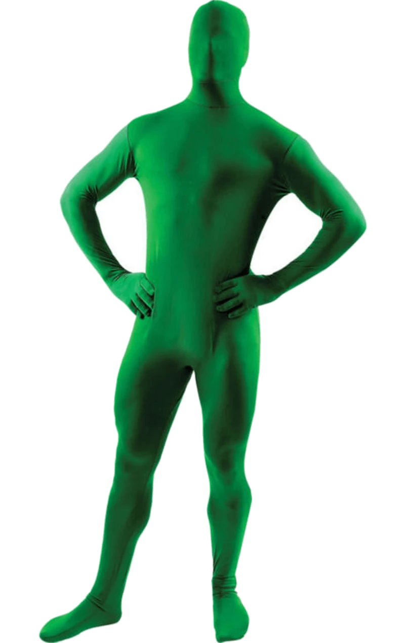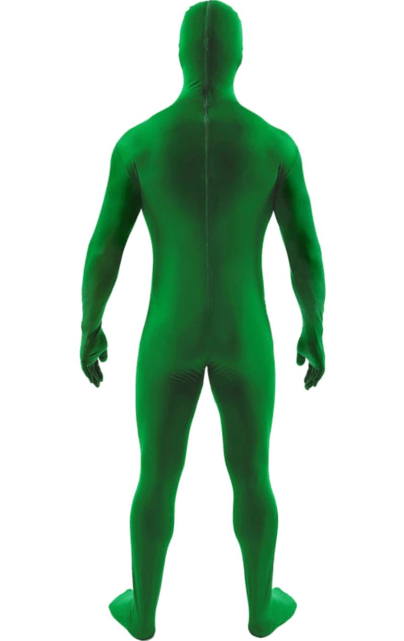 The Adult Green Second Skin Suit is a stretchy green skin suit that covers your entire body and face. It fastens around the back with a zip, so you can easily release your head by unzipping the top of the outfit and releasing the hood.