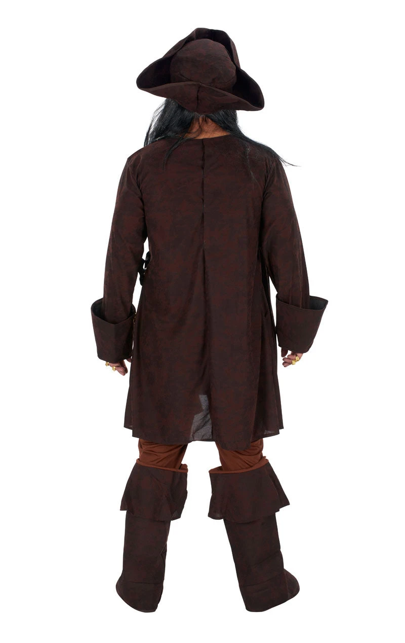 Our Adult Jack Sparrow Pirate Costume comes complete with a long sleeve brown jacket that’s made of a suede-like material, a pair of matching trousers, and to finish off the look, a brown pirate hat. Please note that the wig, sword and moustache aren’t included, but can be purchased separately.