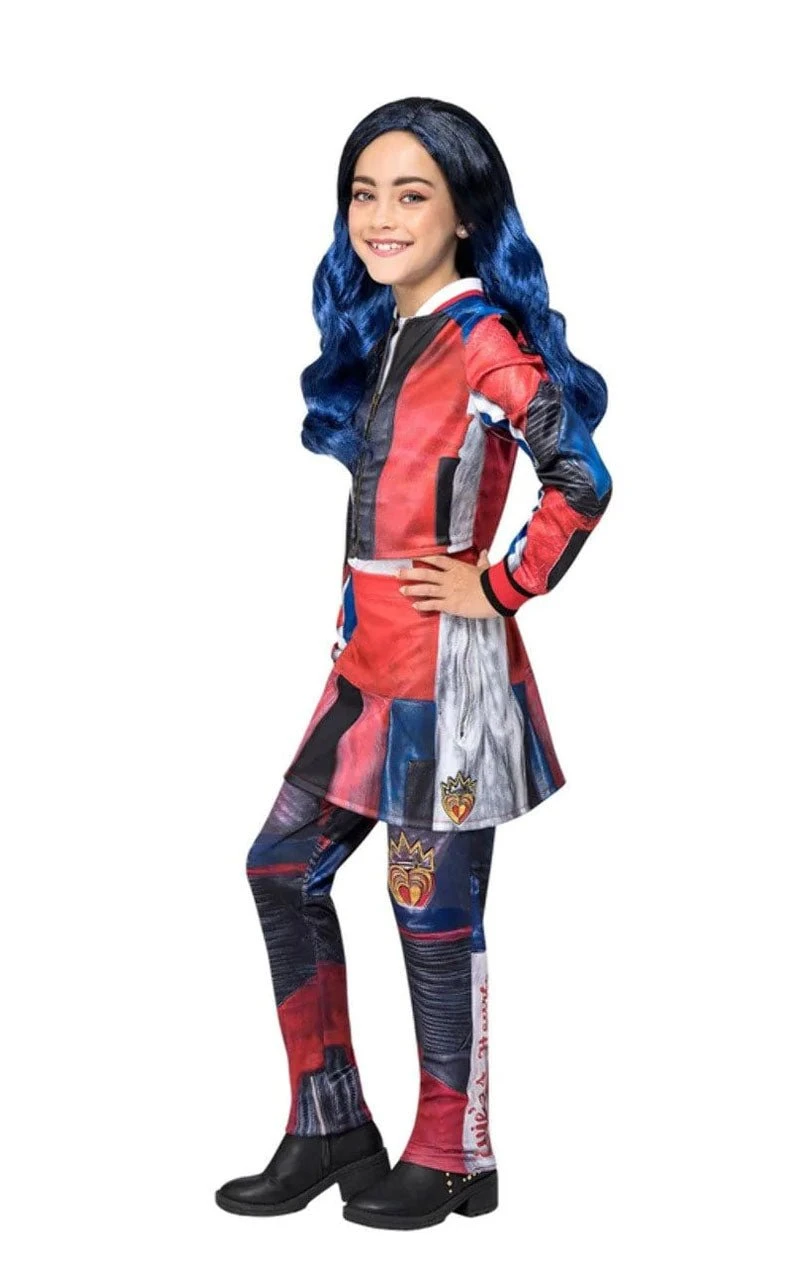 The officially licenced Childrens Evie Descendants Deluxe Costume consists of her signature all in one jumpsuit with a faux jacket and skirt. Check out our Women’s Evil Queen Costume if mum wants to join the party!