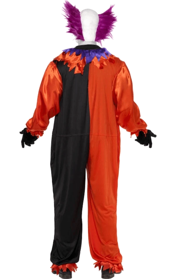 The look is completed with a scary clown facepiece with attached purple hair. The facepiece has added blood splatter to create a truly disturbing appearance.