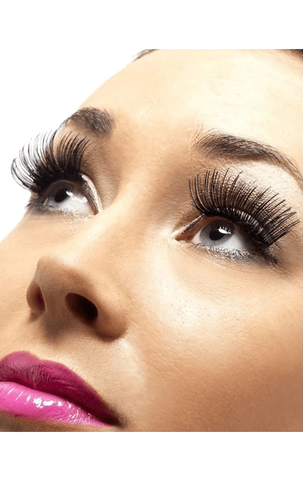 One pair of glossy black false eyelashes and a tube of adhesive for applying them.