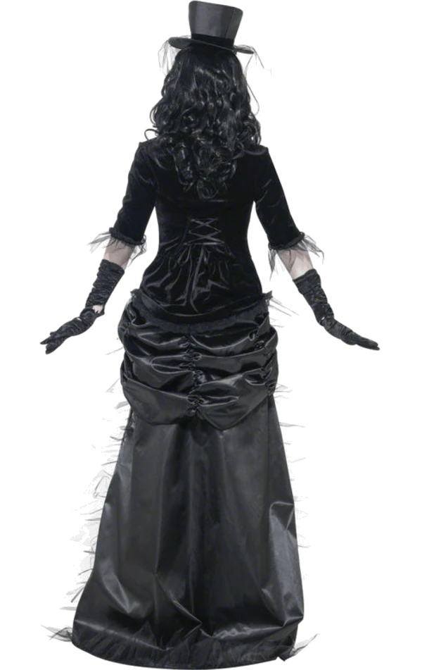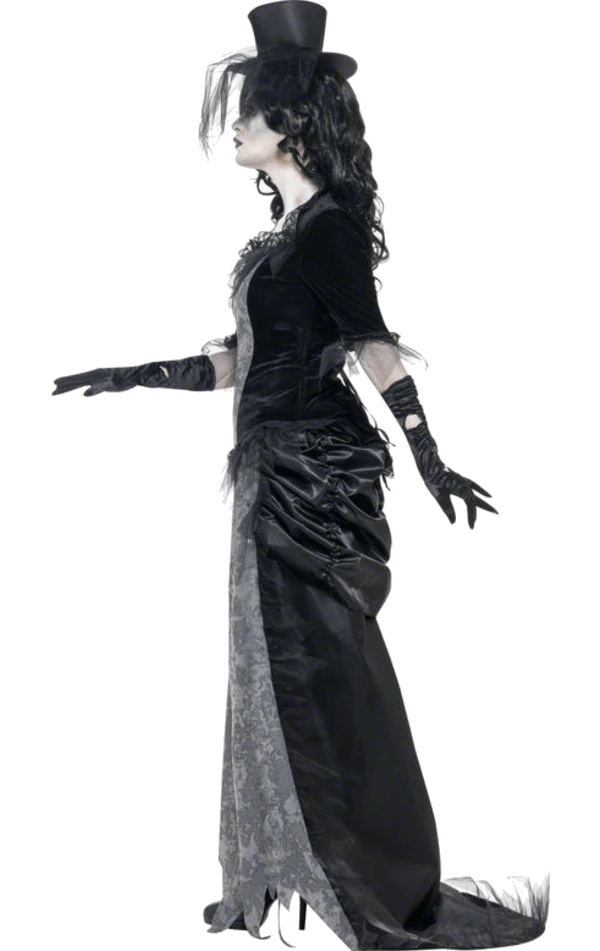 Our Halloween Wild West Woman Costume combines black lace and grey gauze to create a look that is both elegant and eerie. A bone chilling fancy dress idea.