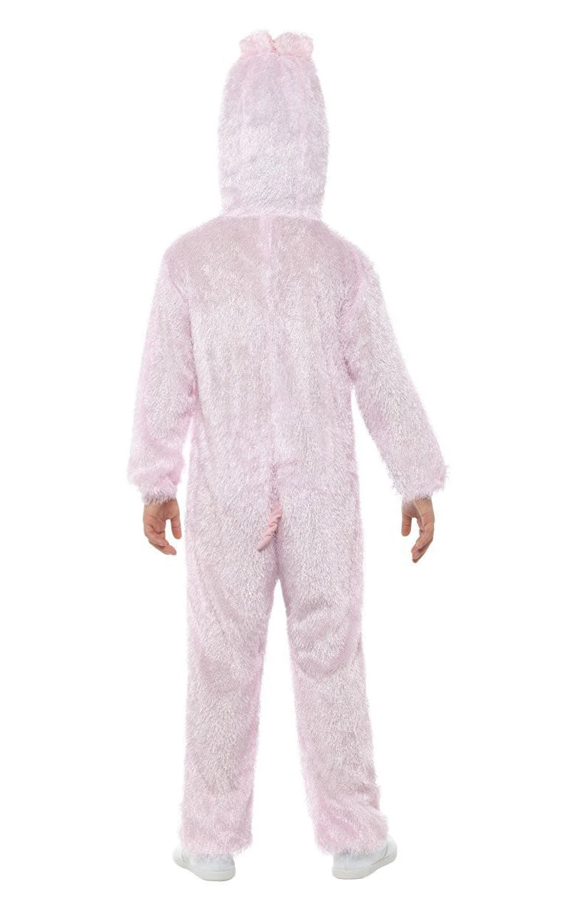 The Child Pig Costume includes a textured pink zip-up jumpsuit with a white stomach and an attached hood. The hood features black eyes, pink folded ears and a stuffed pig snout.